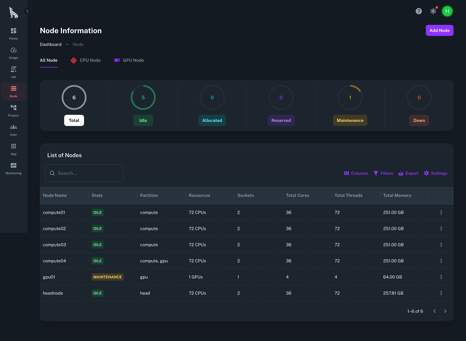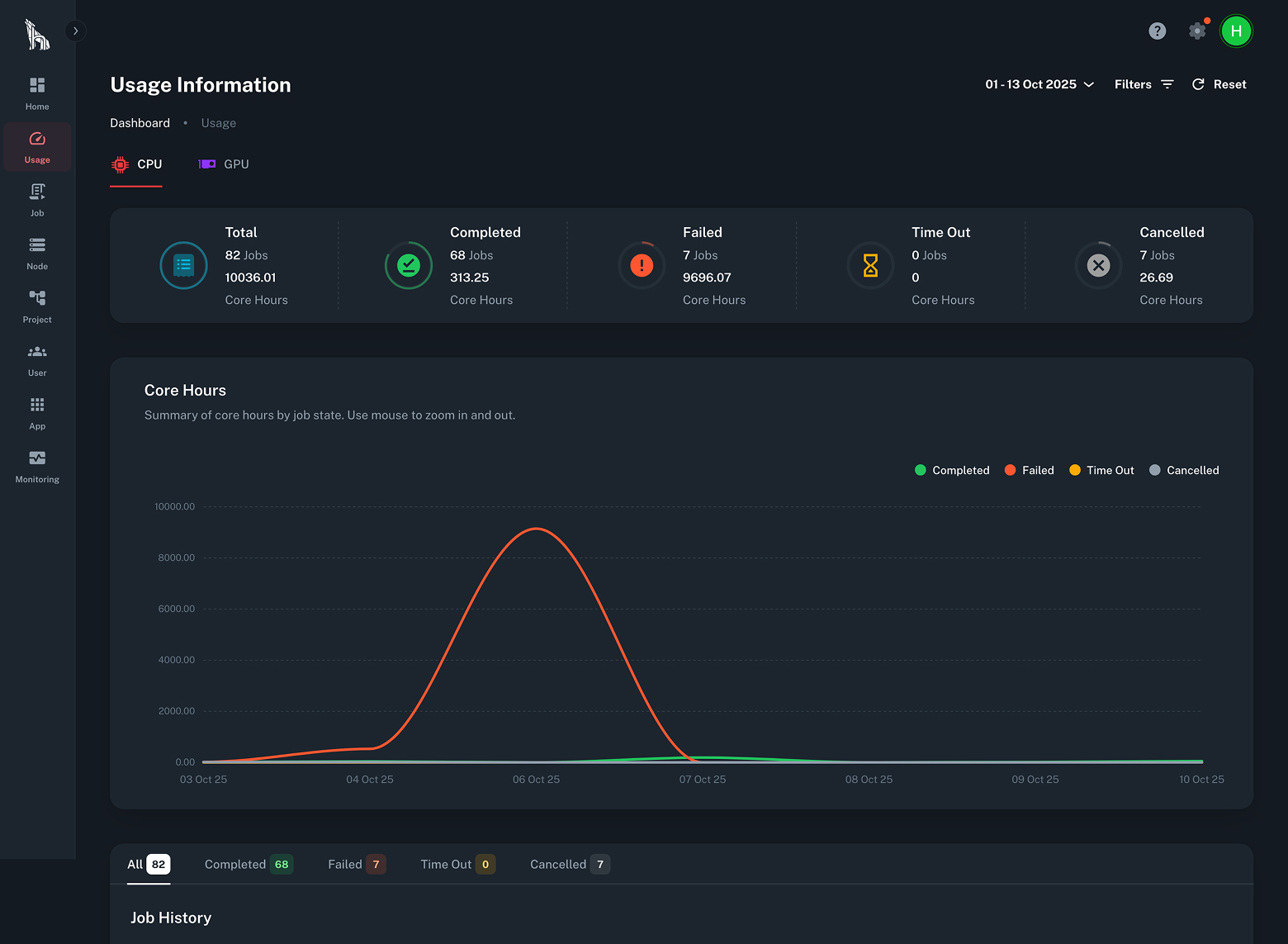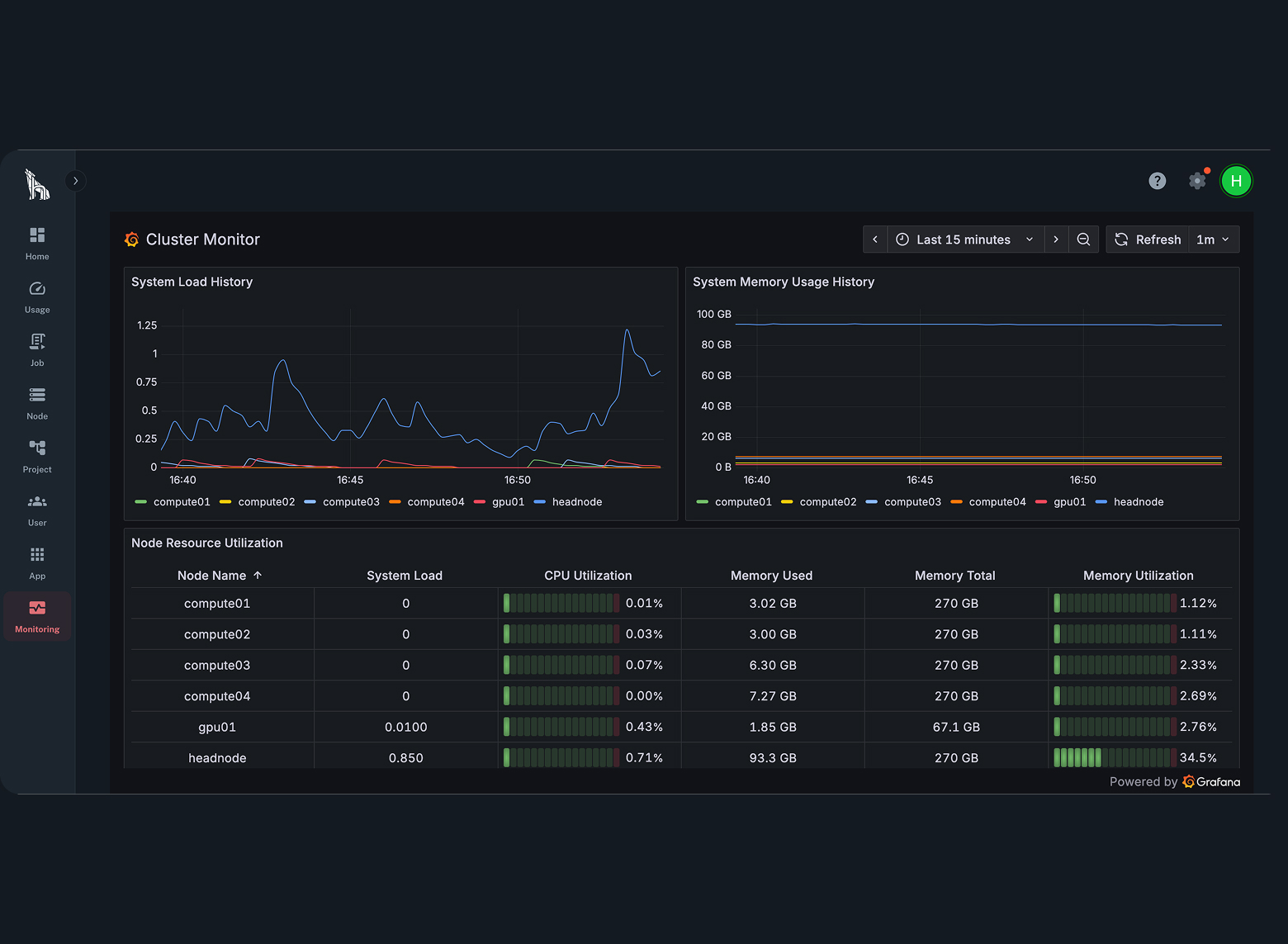 Researchers can submit jobs and monitor progress through the graphical interface without needing HPC administrators. IT teams retain full control of resource allocation and system visibility.